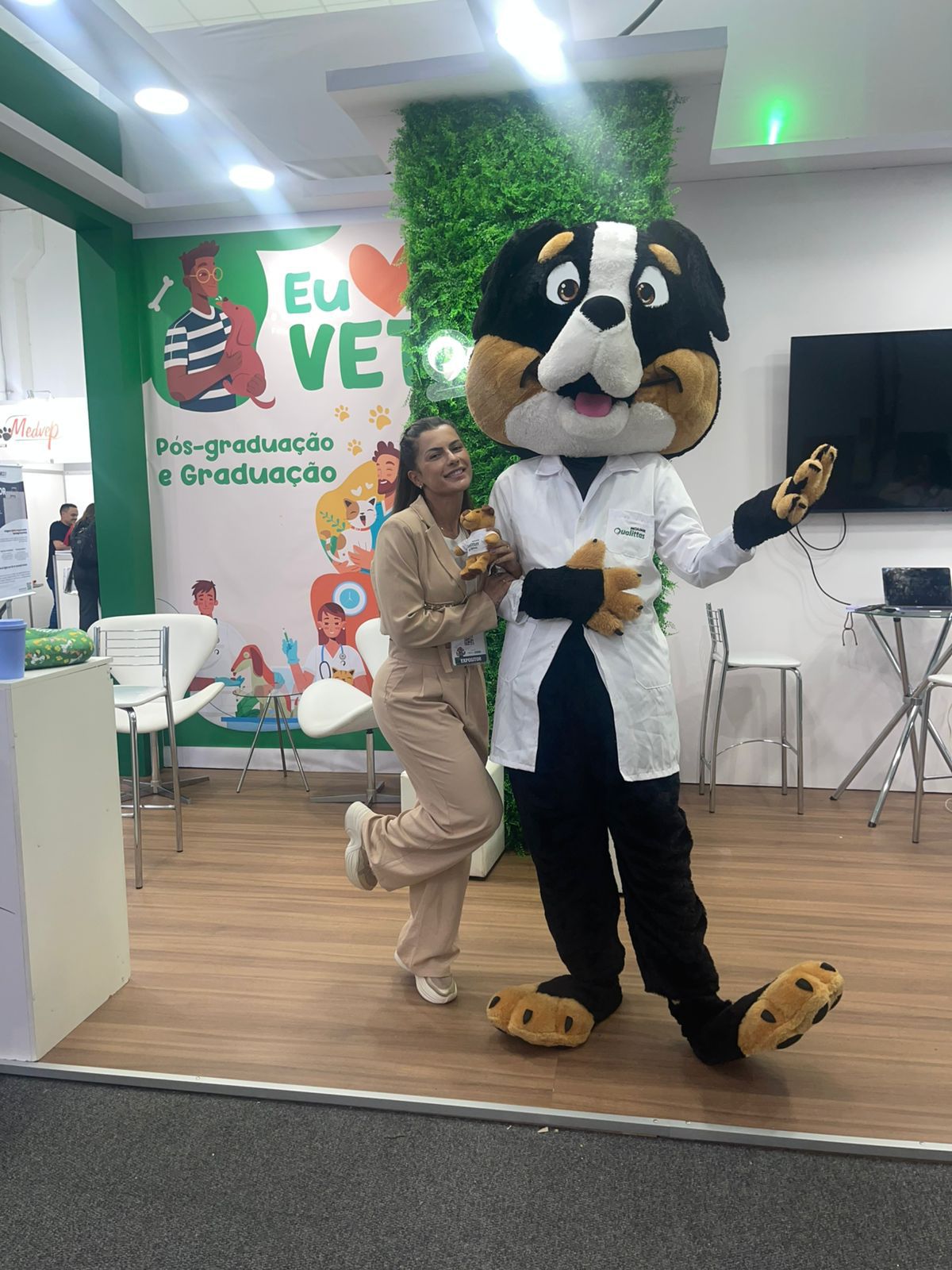 O estande da Qualittas oferece interações com o público com a presença do Qualicão, além de novidades e lançamentos em pós-graduação e graduação em Medicina Veterinaria, com o apoio da equipe de vendas da instituição para tirar todas dúvidas em cada especialidade.